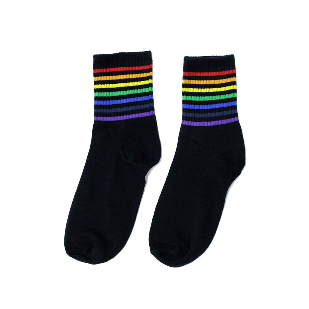¡Experimente una explosión de color con nuestros calcetines de rayas arcoíris! Estos calcetines negros presentan una vibrante raya arcoíris que le agrega un toque de personalidad a cualquier atuendo. Deje que sus pies hablen por sí mismos y muestre su estilo único con estos llamativos calcetines.